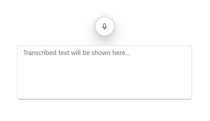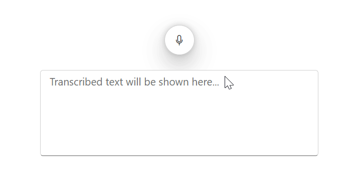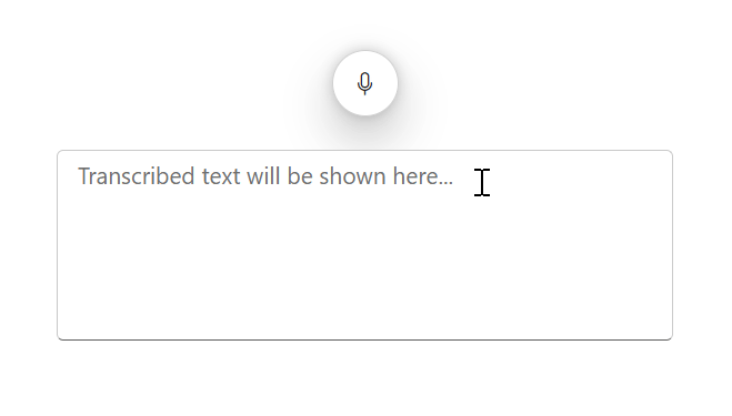 </SfSpeechToText> <SfTextArea RowCount="5" ColumnCount="50" @bind-Value="@transcript" ResizeMode="Resize.None" Placeholder="Transcribed text will be shown here..."></SfTextArea> </div> <style> .speechtext-container { margin: 50px auto; gap: 20px; display: flex; flex-direction: column; align-items: center; } </style> @code { string transcript = ""; }