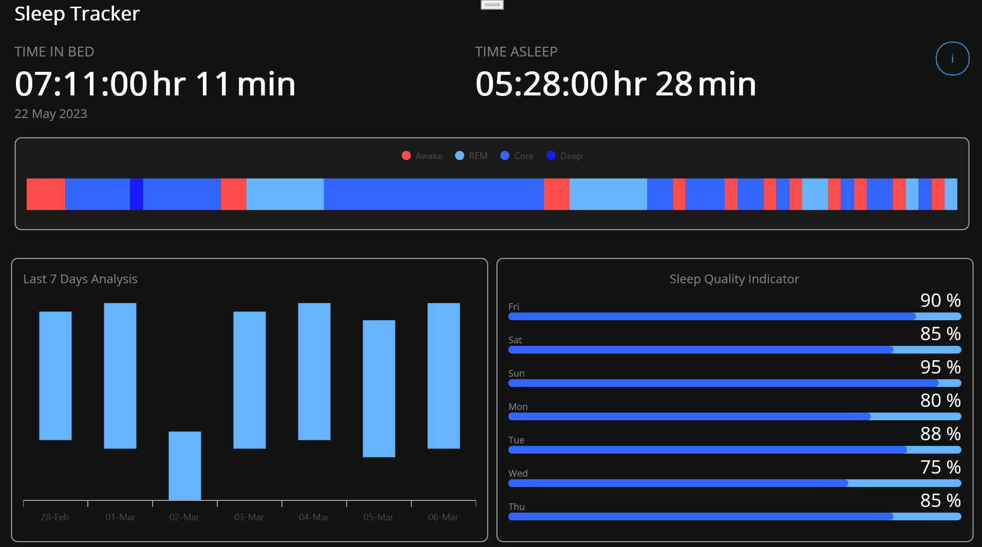 By combining the sleep tracker chart, weekly sleep analyzer, and sleep quality indicator, we create a comprehensive dashboard for sleep analysis. This provides users with valuable insights into their sleeping habits and helps them take steps toward better rest.