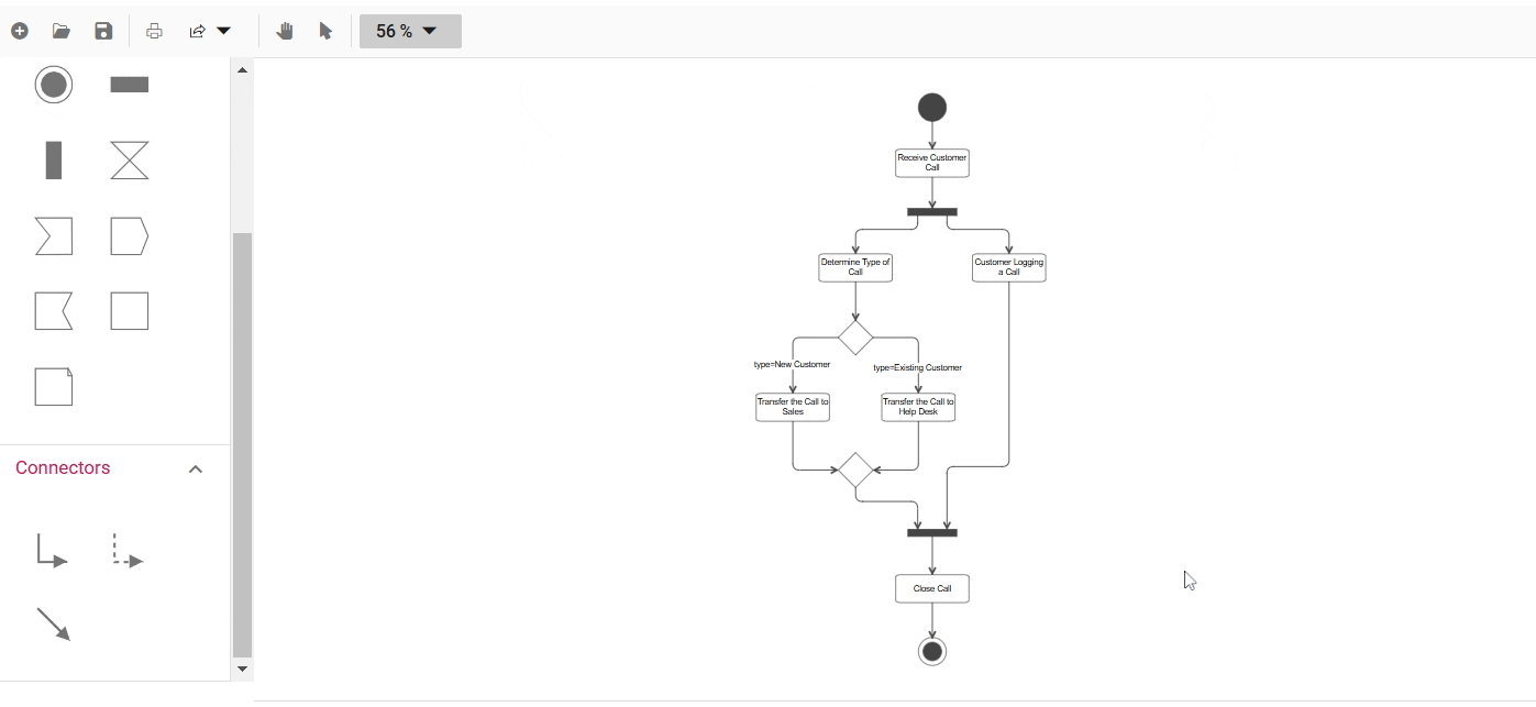 Let’s create a UML activity diagram to represent a customer call log support scenario.