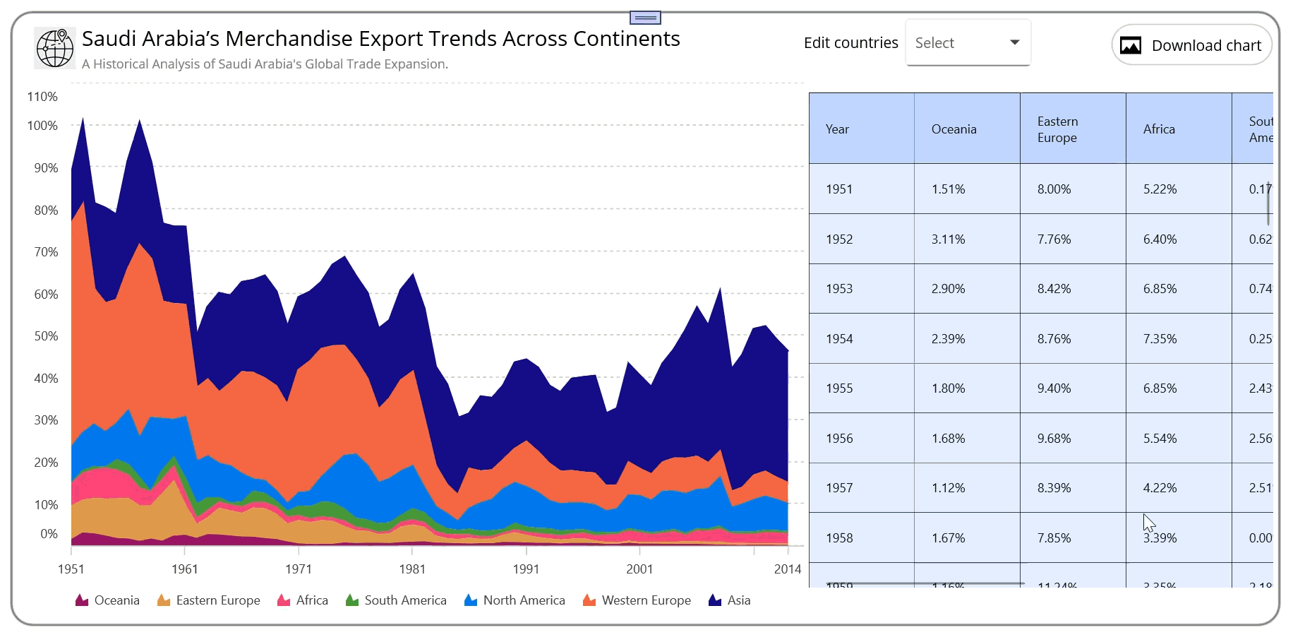 TL;DR: Learn to visualize Saudi Arabia’s export trends across continents using the .NET MAUI Toolkit Stacked Area Chart with series highlighting, trackball integration, and DataGrid synchronization. This guide covers implementing these features to provide users with real-time updates, better insights, and interactive data exploration.