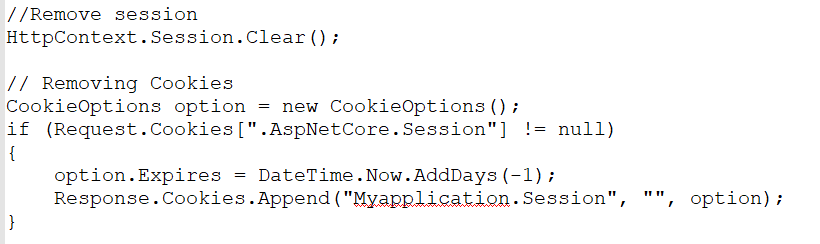 Although, I wish to add some information which I didn’t earlier. I am using .net core which does not allow me to have session.abandon() method.
