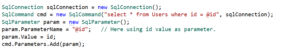 If you want to use inline queries, you must use parameterized queries to prevent SQL injection. The following code example demonstrates a parameterized query.