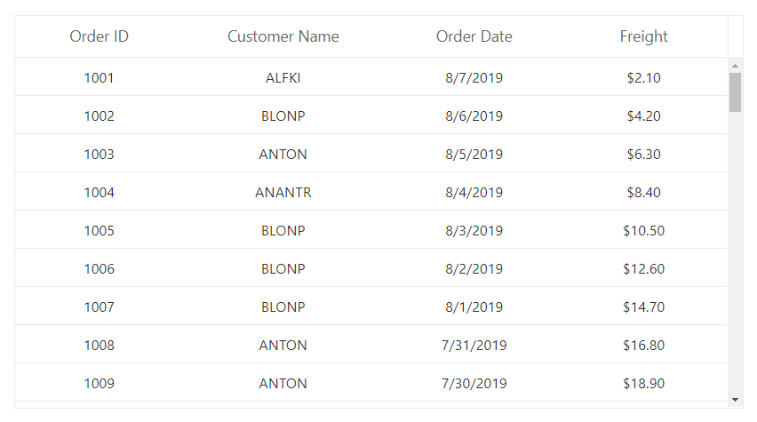The virtual scrolling feature loads and renders data that are needed for the current viewport alone. The rest of the data are loaded on demand while scrolling vertically.