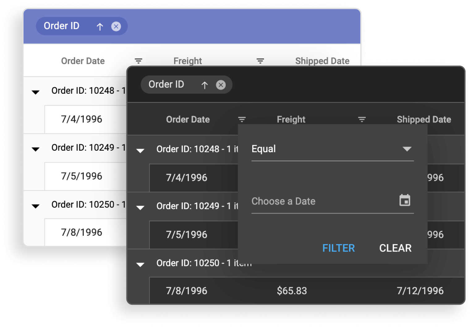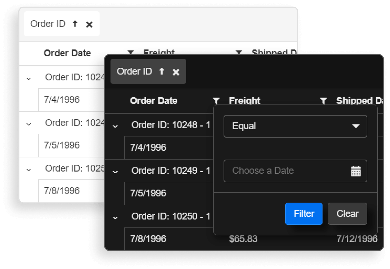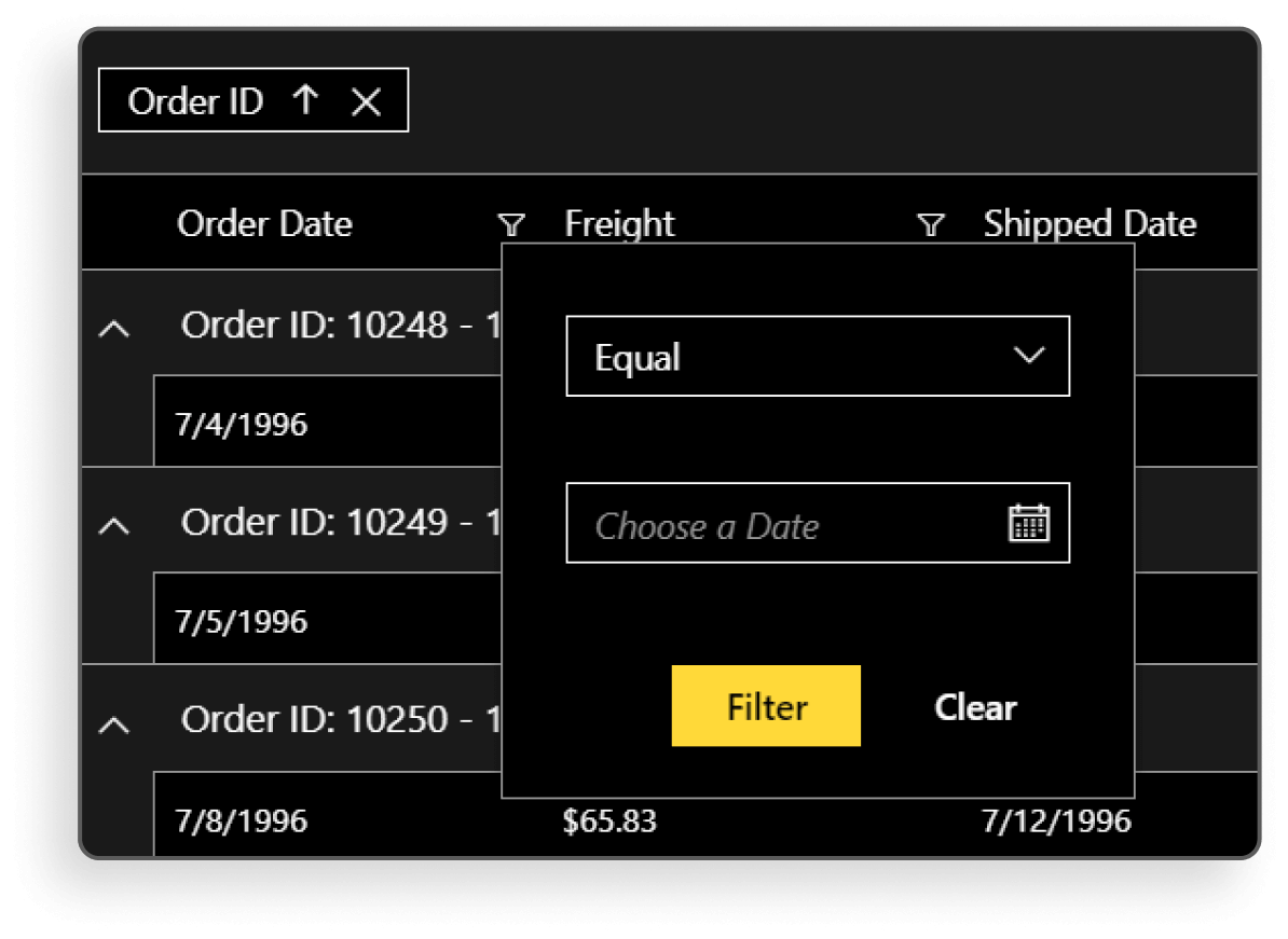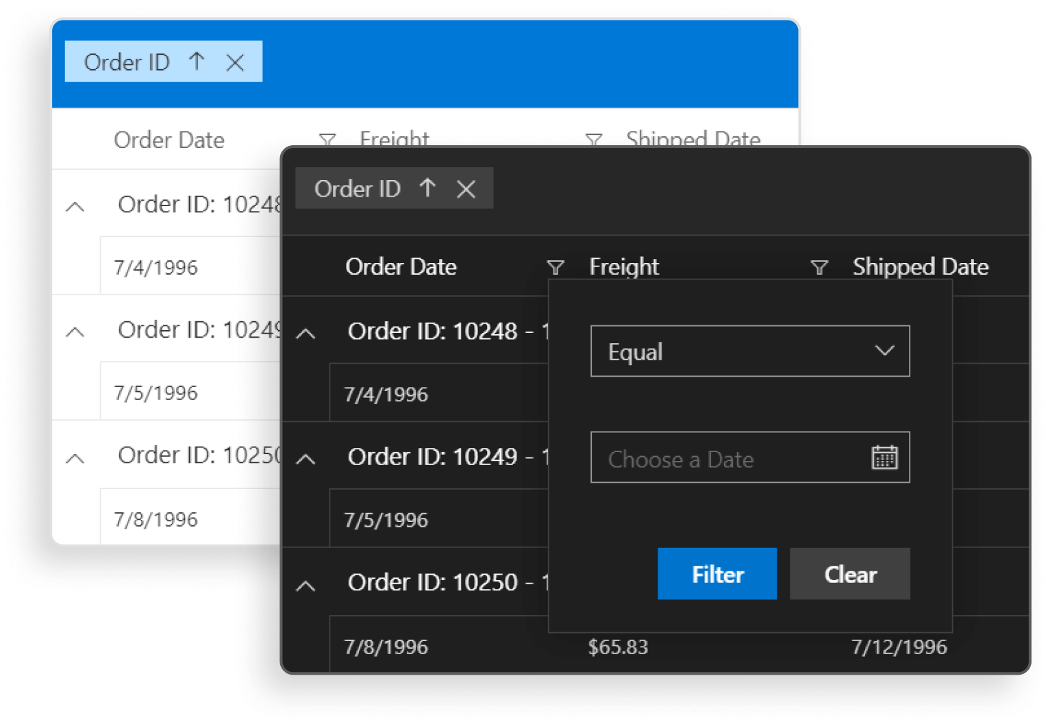 Themes provide an elegant look and feel to an application. Six built-in Sass-based themes are available in our Blazor DataGrid: