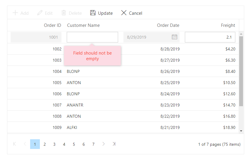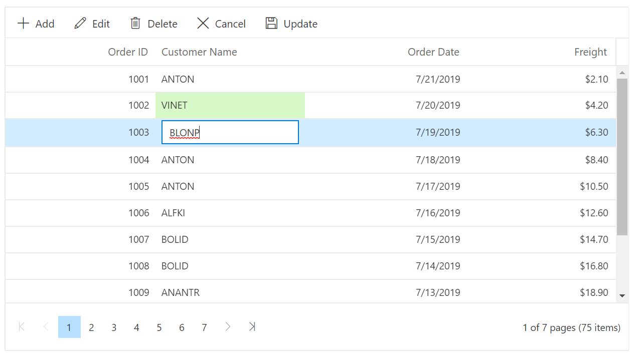 - Keyboard navigation: Ensures that every cell is keyboard accessible. Major features like sort, select, and edit can be performed using keyboard commands alone; no mouse interaction is required. This helps in creating highly accessible applications using this component.