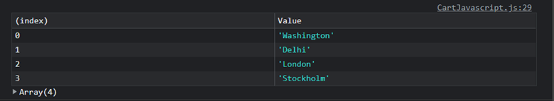 var cities =["Washington","Delhi","London","Stockholm"]; console.table(cities);