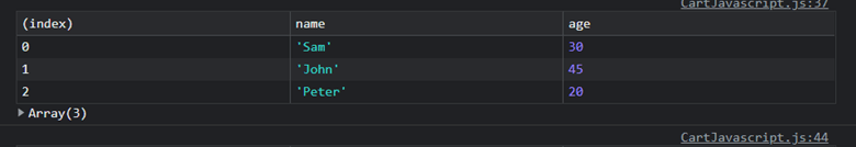 When you have a complex set of objects, you will either use the console.log() method or scroll through the list of objects to inspect the issue. However, you can use the console.table() method to improve the debugging process in such situations. You can use it to report tabular versions of arrays and objects to the console. The tabular data format works beautifully, allowing you to understand your data better and debug your code quickly. You may also sort columns very fast. This method uses any object type, arrays, arrays of arrays, arrays of objects, and nested objects as a parameter.