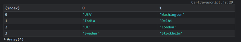 var Destinations =[["USA", "Washington"],["India","Delhi"],["UK","London"],["Sweden","Stockholm"]]; console.table(Destinations);