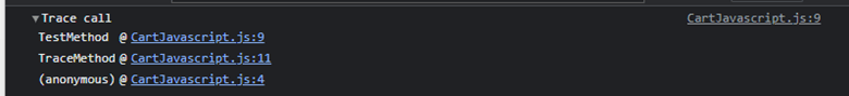 As you can see, console.trace() method prints the given message as well as the trace. Here, TestMethod() is invoked initially and then TraceMethod() is invoked. You can see the line numbers of the method calls which are invoked in the code.