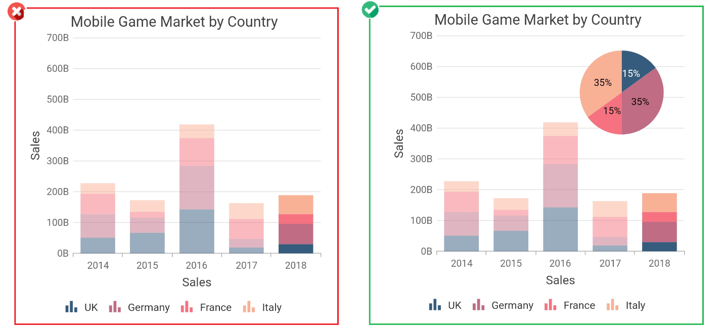 Using meaningful symbols or images in a chart will also contribute to its comprehension. For example, in the following image, the chart on the right is easier to understand at a glance and more aesthetically appealing compared to the one on the left.
