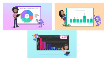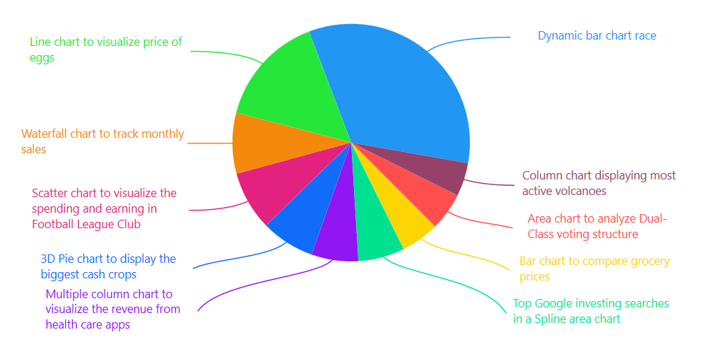 - Sunburst Chart to Visualize the Most Popular Wikipedia Articles: Sunburst charts depict hierarchical relationships. This example explores the popularity of Wikipedia articles, visually connecting subcategories to broader categories.