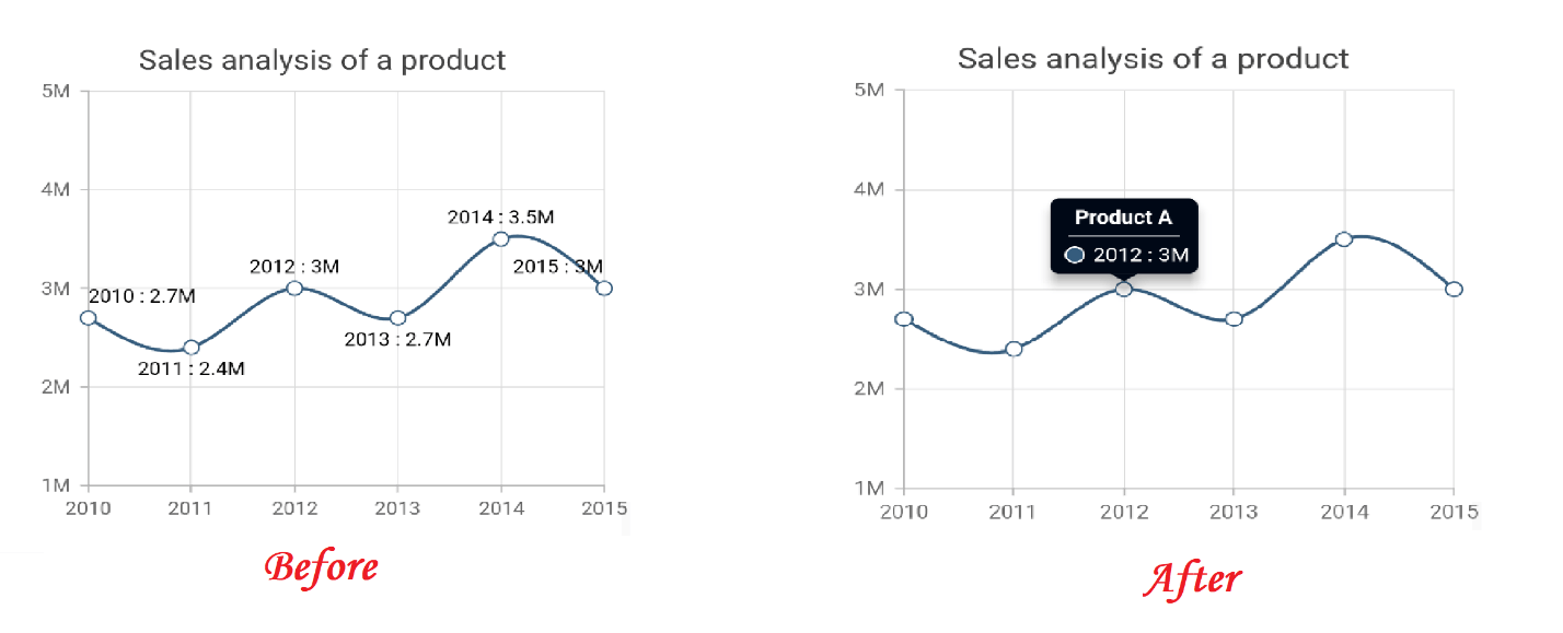 For some real-time data, we deal with very precise decimal values. Displaying long decimal values in the chart will occupy too much space and degrade readability. So, in such cases, you should display the rounded-off values. For example, if your value is 17.8965432219, it should be displayed as 17.9.