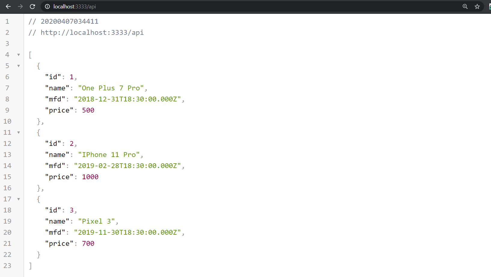 Now, open the browser and enter in the address bar. This will trigger the backend API and you will get the output like the following.