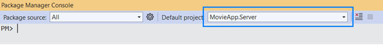 Navigate to Tools >> NuGet Package Manager >> Package Manager Console. Select MovieApp.Server from Default project dropdown. Refer to the image.