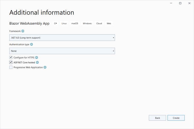 - On the Additional information page, select the target framework .NET 6.0 (Long-term support) and set the authentication type to None. Also, check the options Configure for HTTPS and ASP.NET Core hosted and then click on Create. Refer to the following image.