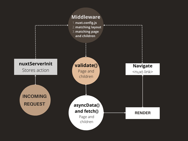 The following flow chart demonstrates what NuxtJS does when the server is called or when the user uses <nuxt-link> to move through the app.