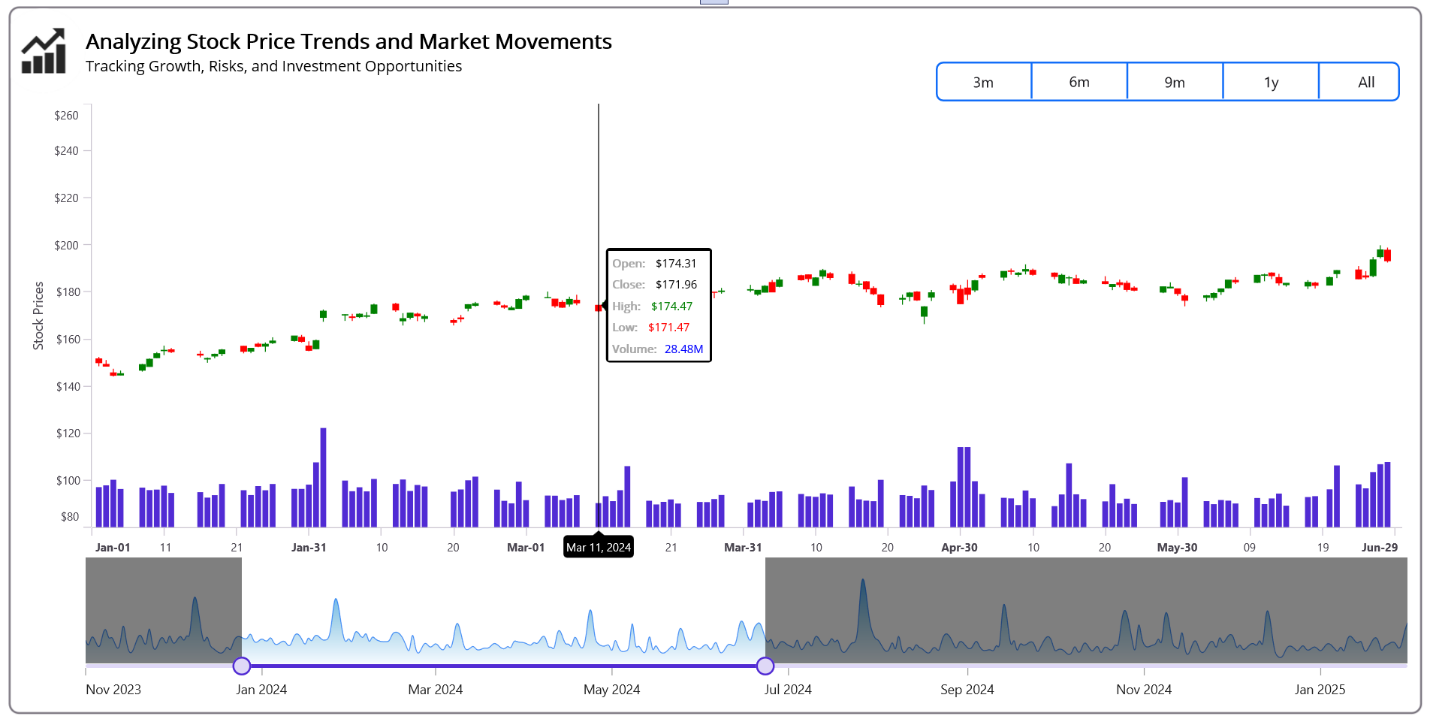 Today, we’ll analyze Amazon’s stock prices using the .NET MAUI Toolkit Candle Chart to gain insights into market trends and price movements. The Candle Chart helps visualize open, high, low, and close (OHLC) values, making it easier to track price fluctuations and trading volume.