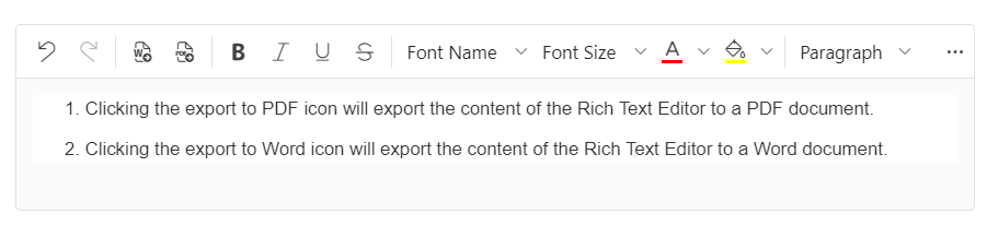 To add ExportWord and ExportPDF tools to the Rich Text Editor toolbar, you can use the  toolbarSettings.Items property. To enable these functionalities, the serviceUrl must be correctly configured within the exportWord and exportPdf. These API endpoints handle the export process and manage the server-side generation of Word and PDF files, respectively.