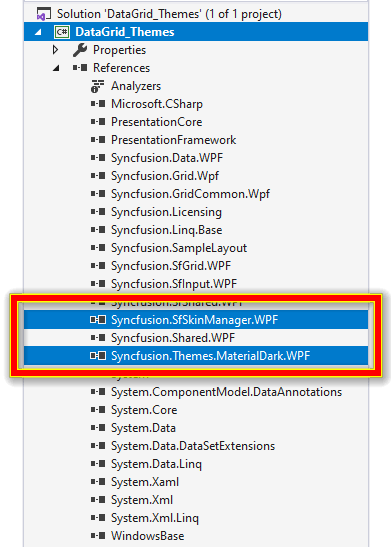 The latter is the preferred option and, in this illustration, the exported “MaterialDark” theme project is compiled and “Syncfusion.Themes.MaterialDark.WPF” is used further.