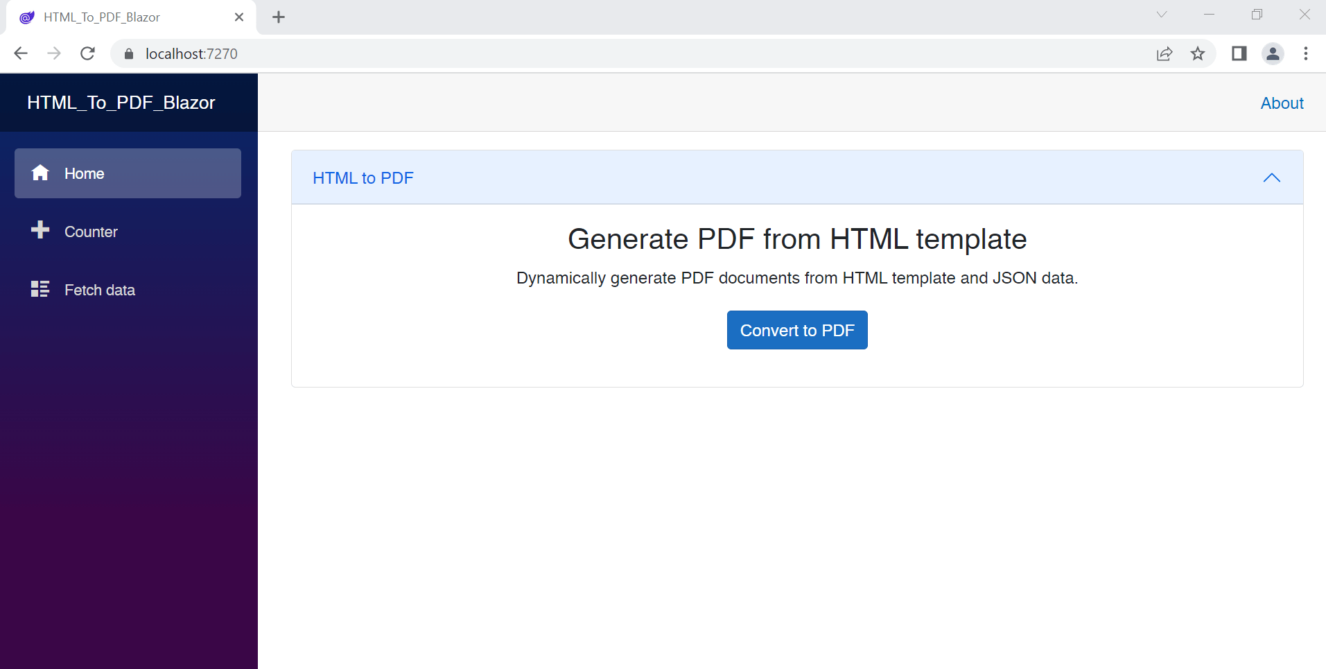 Step 2: To generate a PDF document using the client application, send an asynchronous POST request to the specified URI (e.g., https://localhost:7094/api/convertToPDF) on the localhost. This will send the request to the server application, which will convert the HTML to PDF and send the response back to the client. After running the client application, click the Convert to PDF button to initiate the HTML to PDF conversion process and generate a PDF document named HTMLToPDF.pdf in the designated folder.