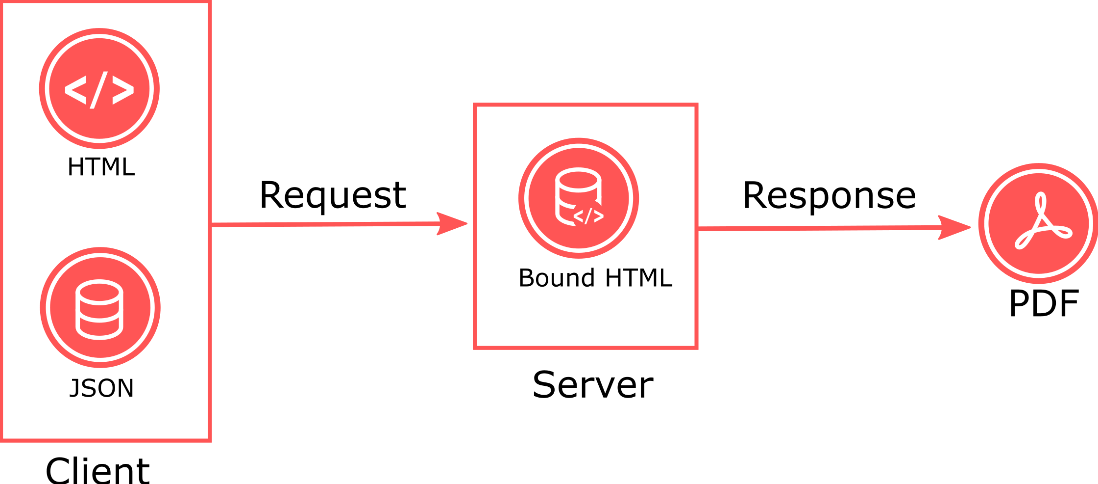 Finally, the HTML text, JSON data, and assets are combined and converted into a PDF document using HtmlToPdfConverter.