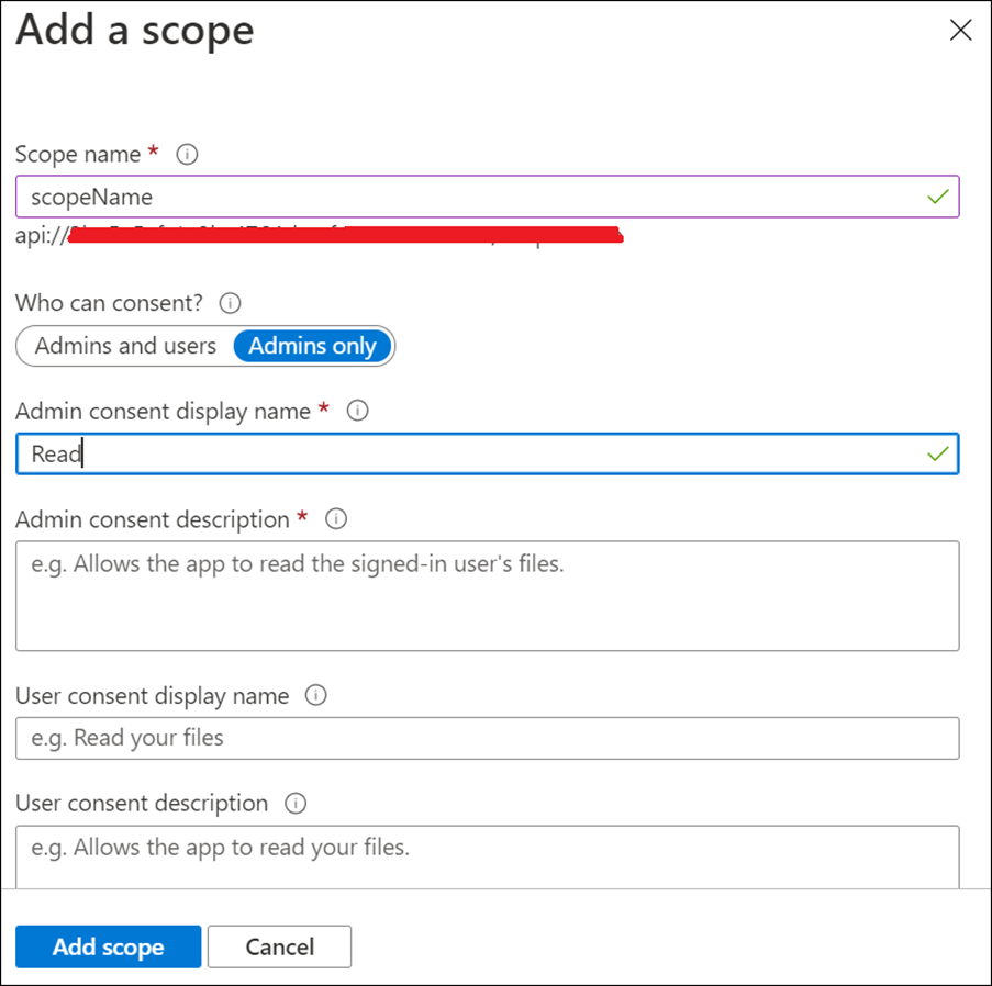 - Then, provide the scope name, admin consent display name, and admin consent description and click Add scope. Now, the scope API will be created. Copy those scope API values.