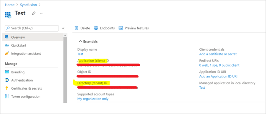 - Get the application client ID and directory tenant ID from the overview page (in the left pane).