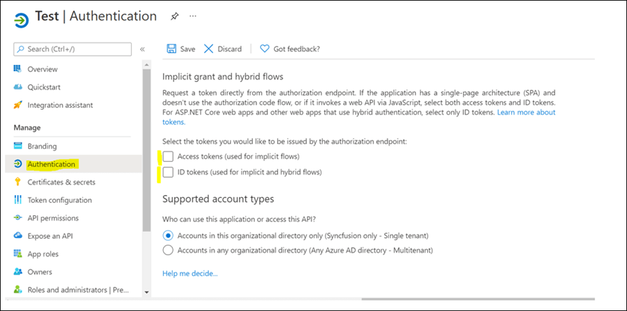 - Now, the app will be registered. Navigate to the Authentication page (in the left pane) and select the ID tokens checkbox.