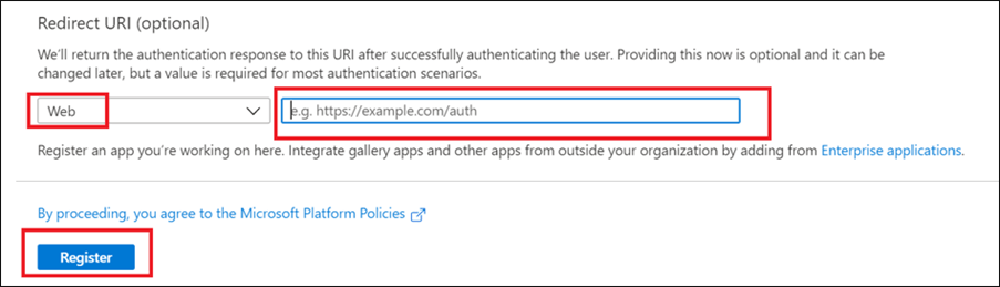 - Next, select the Web platform from the dropdown, type your application’s redirect URI, and then click Register.