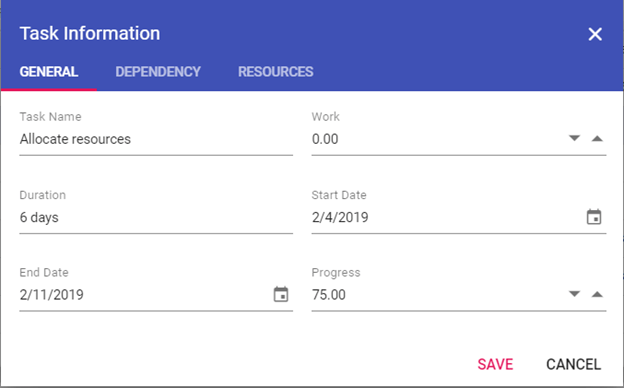 Gantt Chart Showing Dependency Tasks - The Edit dialog feature helps us categorize all the task information in tabs, which clearly delivers information about the task.