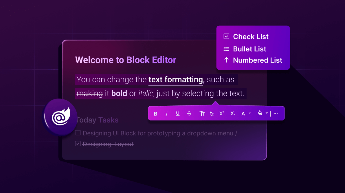 • Events-driven customization: Hook into events like block add/remove/update, selection change, command execution, paste, and mention selection.