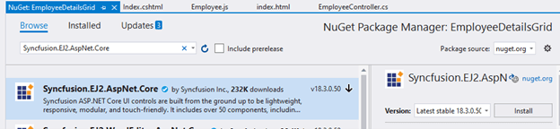 Step 2: Now, switch to the Browse tab and search for the Syncfusion.EJ2.AspNet.Core NuGet package. Then, install it in your application.