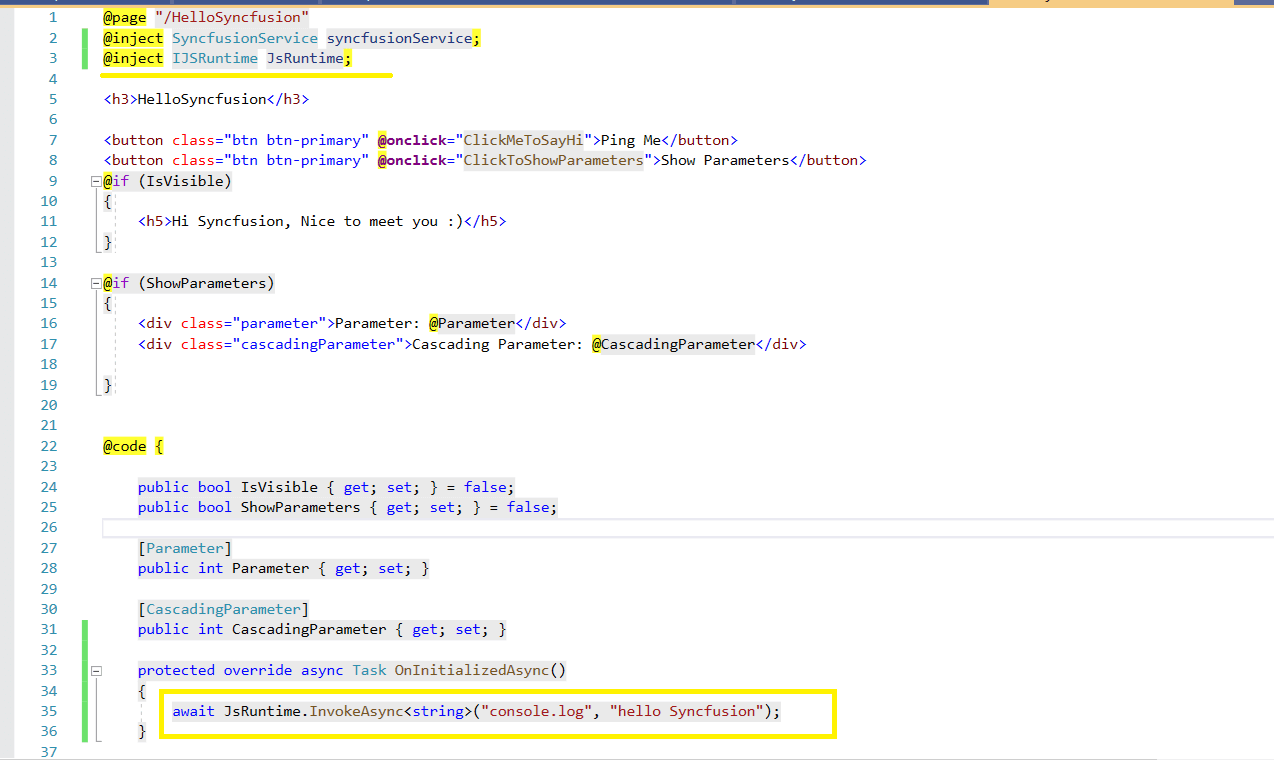 @page "/HelloSyncfusion" <h3>HelloSyncfusion</h3> <button class="btn btn-primary" @onclick="ClickMeToSayHi">Ping Me</button> @if (IsVisible) { <h5>Hi Syncfusion, nice to meet you :)</h5> } @code { public bool IsVisible { get; set; } = false; protected void ClickMeToSayHi() { IsVisible = true; } }In the above code, we have written a test case for the @onclick=”ClickMeToSayHi” event. After the button is clicked, a message will be shown below it. This operation is handled in this event.