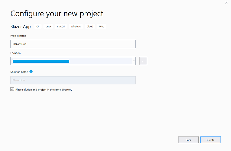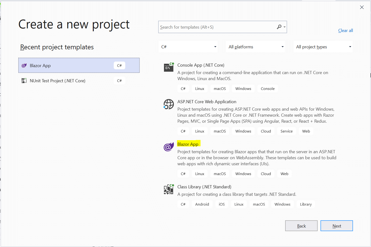 - Select Blazor App and then click Next as shown in the following screenshot.