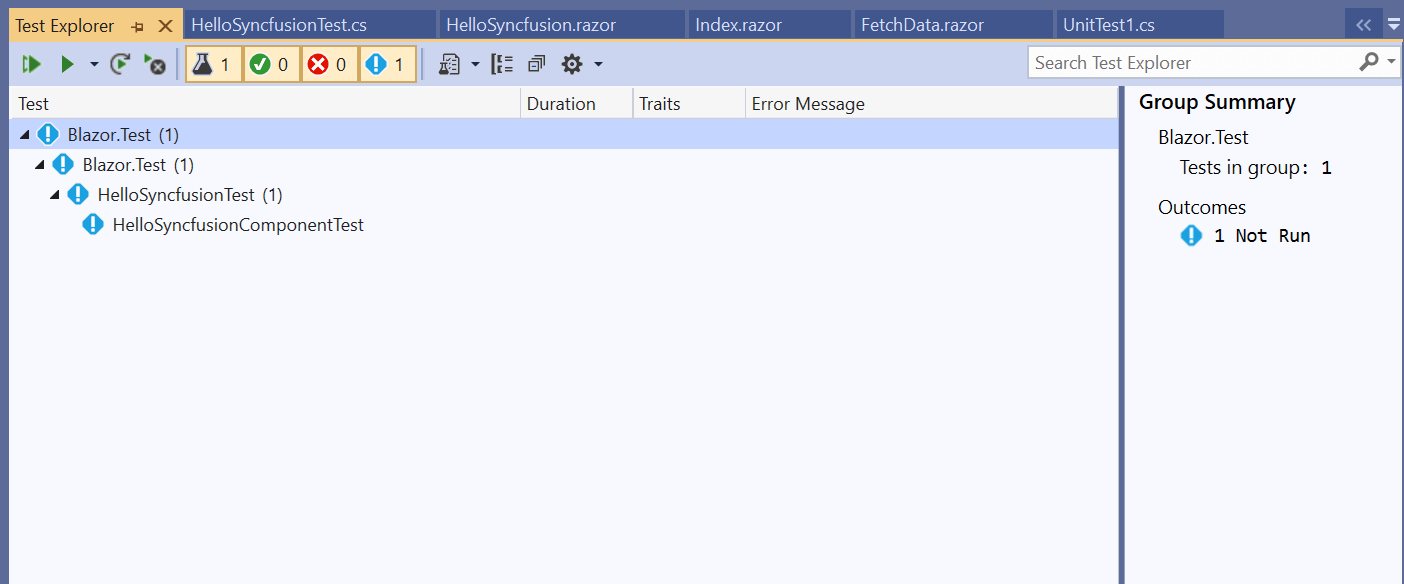 [Test] public void SayHiByClick() { // Arrange using var context = new Bunit.TestContext(); // Act var cut = Context.RenderComponent<BlazorbUnit.HelloSyncfusion>(); cut.Find("button").Click(); // Assert cut.Find("h5").MarkupMatches("<h5>Hi Syncfusion, Nice to meet you :)</h5>"); }From the test method, var cut = Context.RenderComponent<BlazorbUnit.HelloSyncfusion>(); renders the Blazor component.