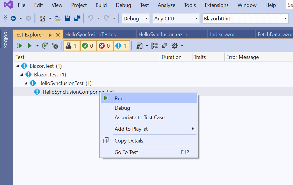 - Right-click the HelloSyncfusionComponentTest method, and then click Run.