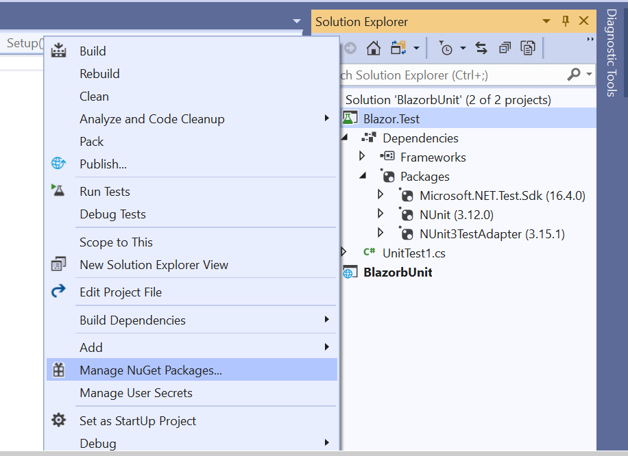 - Right-click the test project and select Manage Nuget Packages as shown in the following screenshot.