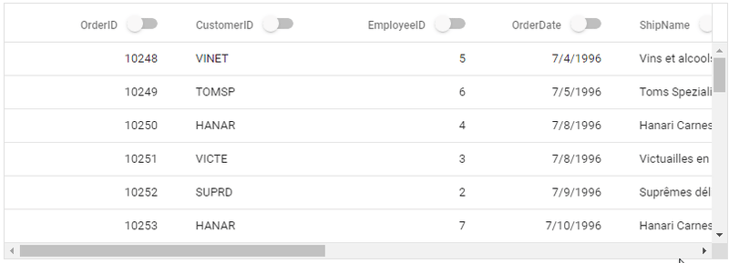 With most data grid components, users can only pin a column during initial rendering, but Syncfusion Data Grid lets users pin a column dynamically. The following demo illustrates how to pin a column by clicking the toggle icon in the column header. It has been achieved with minimal configuration in the Data Grid.