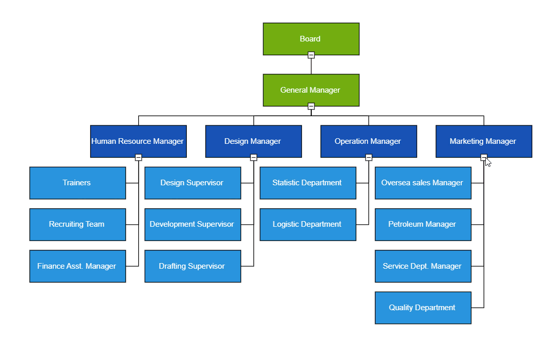 The Syncfusion Blazor Diagram component is a feature-rich component for creating or visualizing interactive diagrams. It allows users to create organizational charts using either C# code or a visual interface with seamless interaction and editing capabilities.