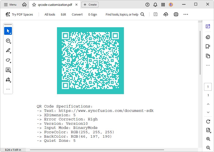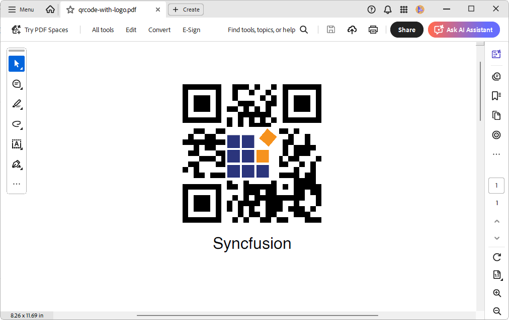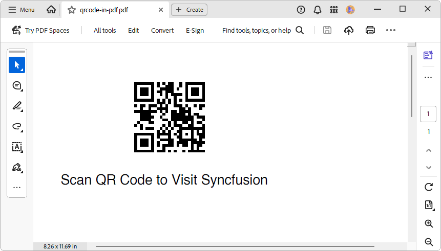 }This creates a PDF containing a QR code linked to Syncfusion’s website.