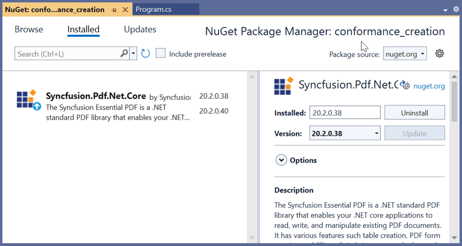 Note: To convert the existing PDF to a PDF/A conformance document, you have to add the Syncfusion.Pdf.Imaging.Net.Core NuGet package to your .NET Core project.