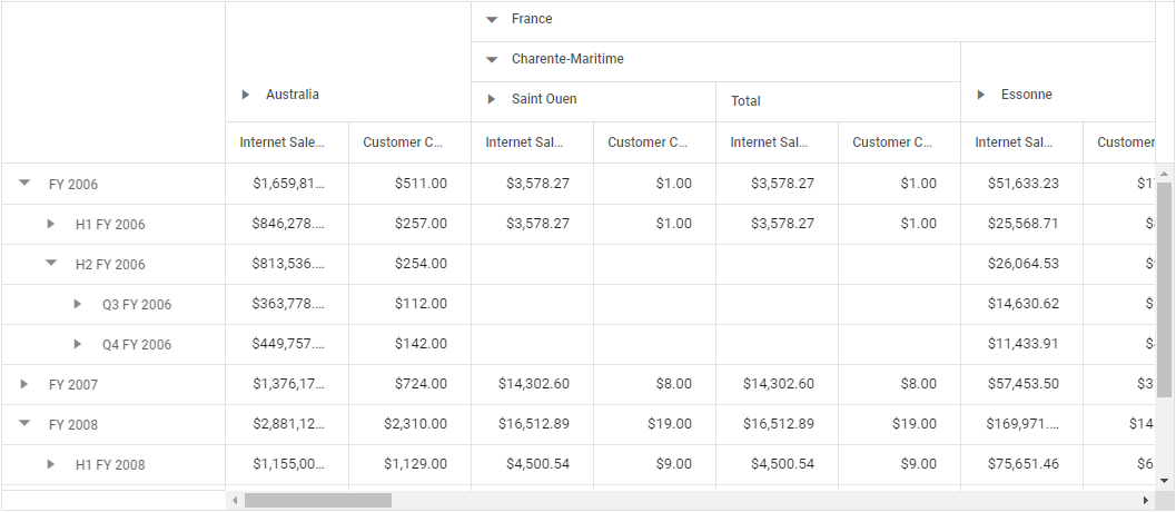 Start to load large amounts of data, up to 1 million records, and view them on demand through virtual scrolling options without any performance degradation. Here, the cell data is set to occupy only the viewport area of the pivot table and to continue to update on every scroll action. Even the other UI operations, such as drill up and down, filtering, sorting, and drag and drop, can work perfectly with any number of records.