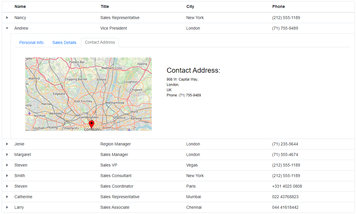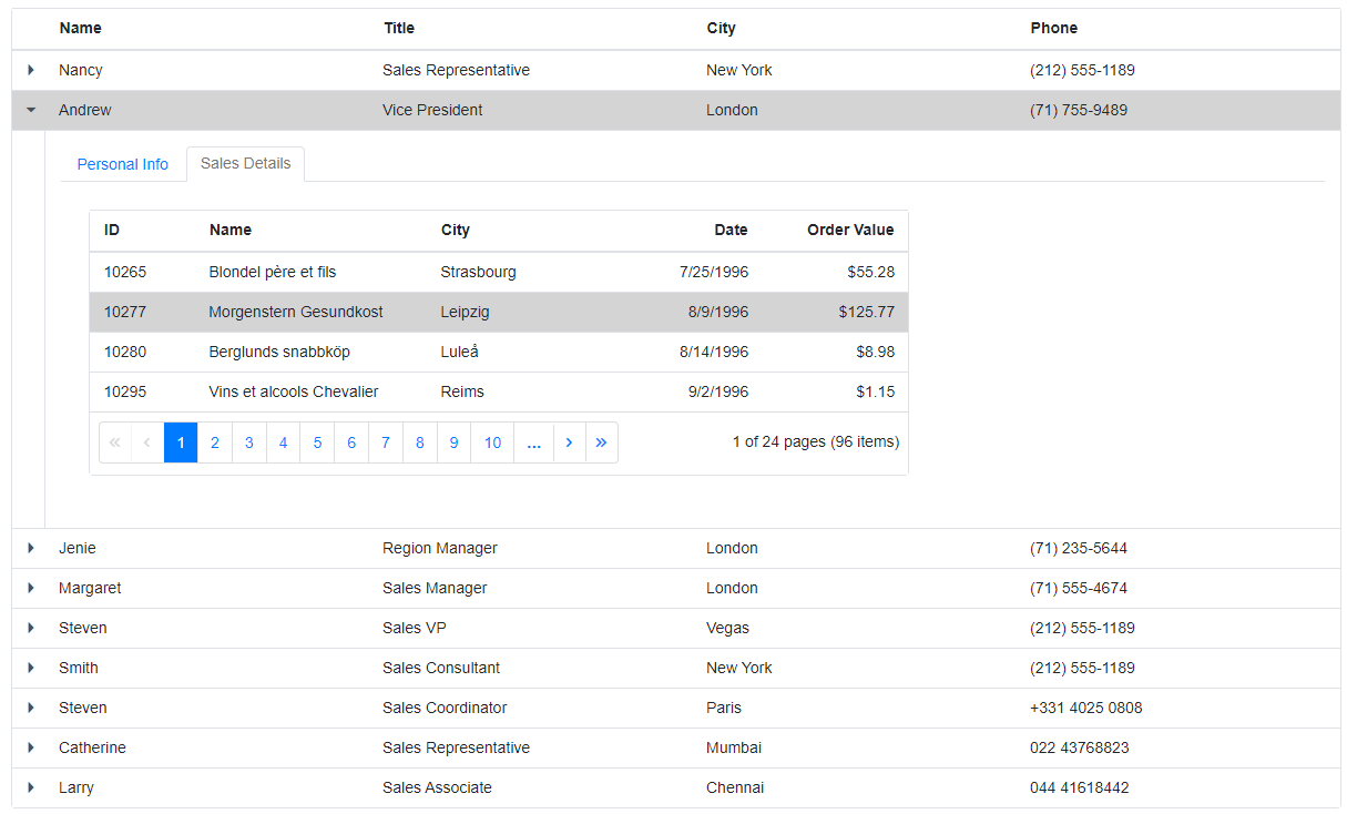 Thus, the master-detail view allows you to visualize the parent-child relationships by displaying the categorized grid data in a hierarchical style. The “detail” area displays the corresponding child information of the selected parent grid record and it could either display a child grid or any kind of customized information inside it.