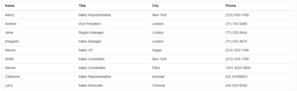 I’ll be using a Blazor DataGrid component to design the top-level master grid UI view with limited fields like each salesperson’s name, designation, city and phone number.