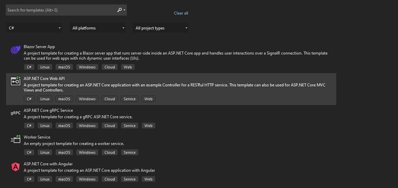 Now, open Visual Studio 2022 and create a new project. Then, select the ASP.NET Core Web API project template as shown in the following figure.