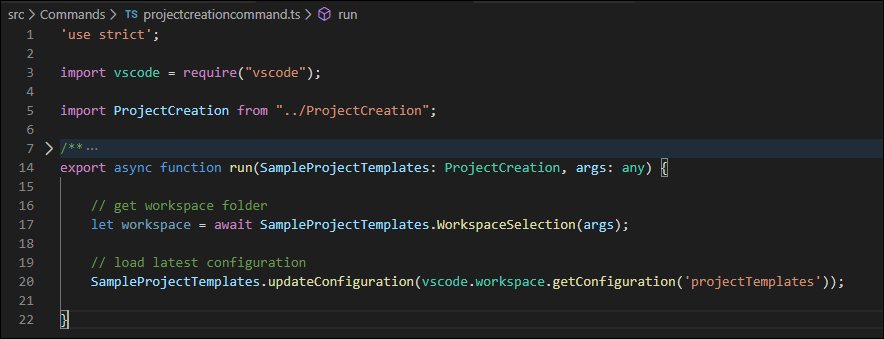 Step 2: Add the code to get the current workspace location and load the configuration in the projectcreationcommand.ts file as shown in the following screenshot.