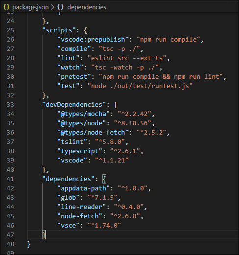 Step 3: Then, add the required NPM packages in the packages.json file by adding its dependencies. As you can see in the following screenshot, I have added appdata-path, glob, line-reader, node-fetch, and vsce to perform actions in the back end.