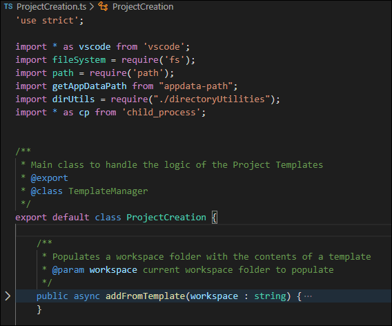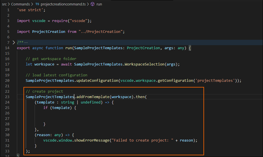 Step 9: Call the addFromTemplate() method inside the command we created in the projectcreationcommand.ts file to run this project creation process when a project is created using the option we made in the VS Code palette.