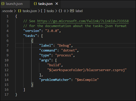 Now, we’ll create the tasks.json file with the task names debug, build, and NuGet restore since we need to perform these operations while creating a new project using our extension.