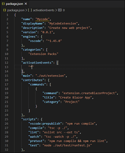 The package.json file has the VS Code extension name, description, author, license, and other details. Open the package.json file to edit the extension details as shown in the following screenshot.